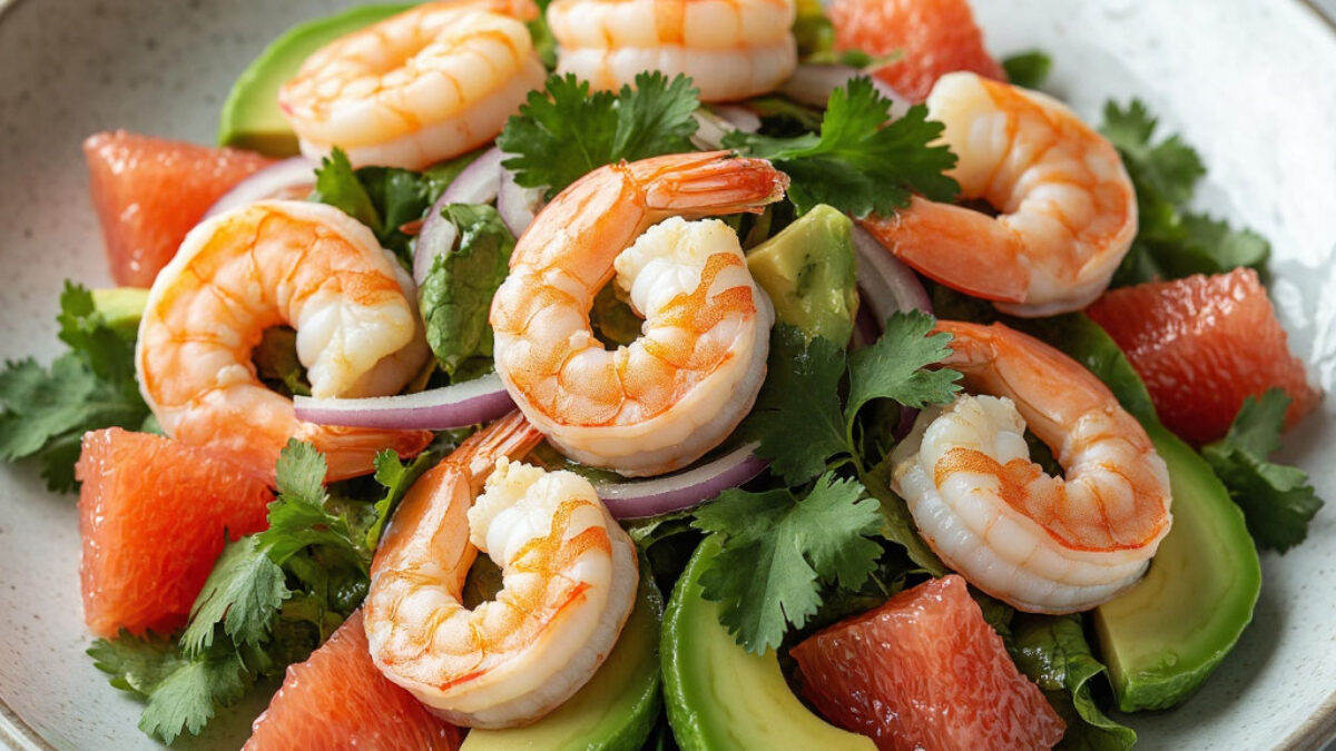 Шаг седьмой. Добавь к салату грейпфрут, лук и авокадо, аккуратно перемешай. Сверху выложи тёплые креветки, полей цитрусовой заправкой и украсьте рубленой зеленью.