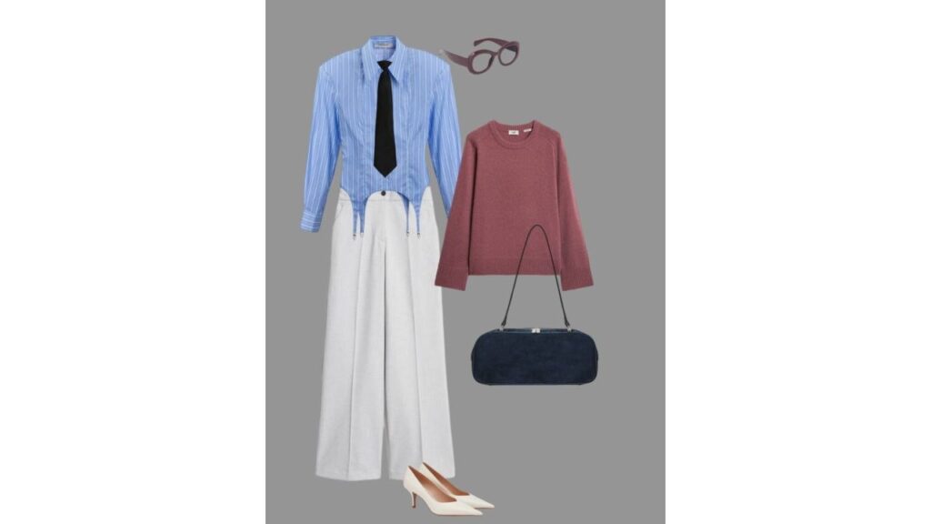 «Рубашка с объёмными плечами выступает в качестве акцента. А галстук на женщине – современный тренд. Связывают всё чёрная обувь и сумка», – дала комментарий Анастасия Михайлова.
