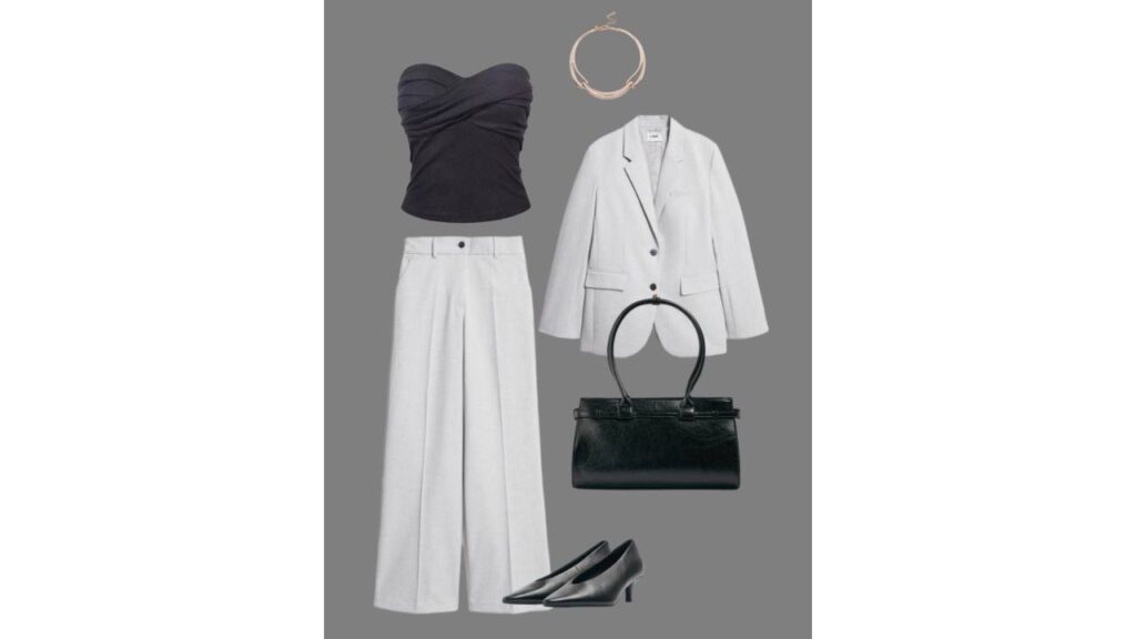 Оставляй тот же пиджак, сумочку и туфли. Галстук и платок замени на милое ожерелье. В топе шея полностью открыта, поэтому такое украшение будет дополнять образ.